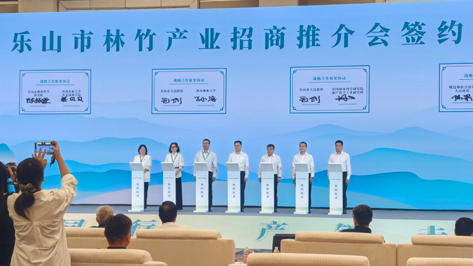 会上,中国工程院蒋剑春院士、刘世荣院士、杜官本院士出席大会并作主旨报告,为竹产业发展带来前沿学术视角。姜贝贝教授参加林竹产业招商推介会签约仪式并与乐山市林业科学研究院签订战略合作框架协议。本次大会围绕“以竹代塑”“乡村振兴”国家战略和我国竹产业发展趋势,为广大竹业工作者搭建学术交流平台,集中展示广大竹业科技人员的最新研究成果。