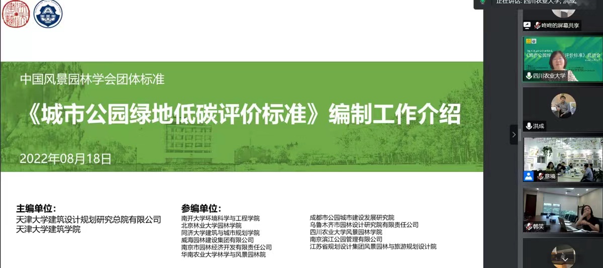8月18日上午,中国风景园林学会《城市公园绿地低碳评价标准》编制工作启动会在线上举行,作为学会会员单位和参与“标准”制定单位,我校91pron 李西教授带领编制团队参加启动会。