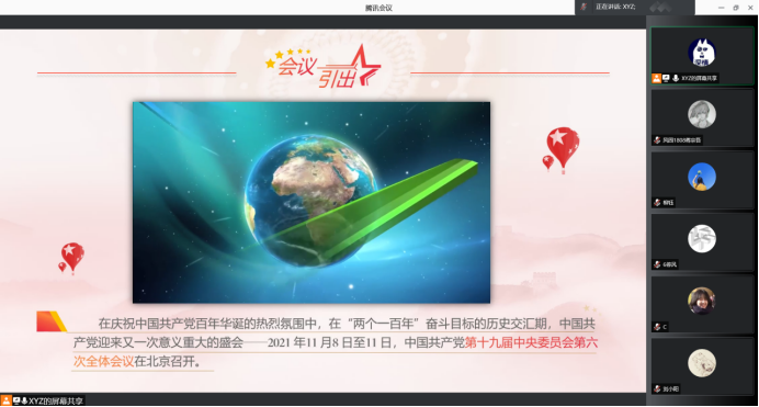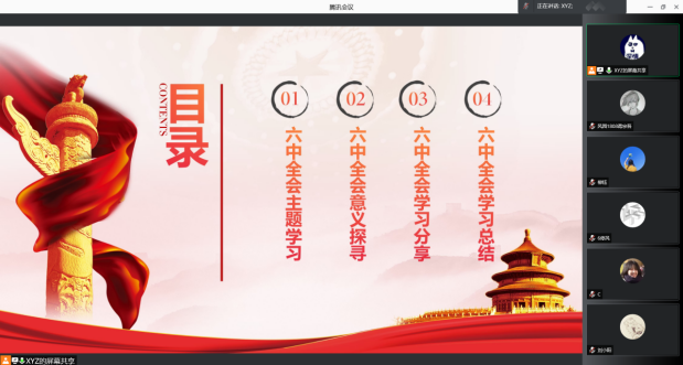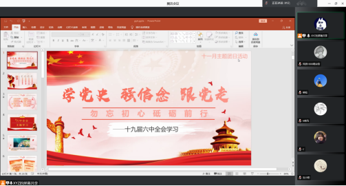 021年11月24日,风景园林1808班的第十九届六中全会主题学习团日活动在腾讯会议顺利进行,参与本次团日活动的有监督员同学周雨欣和风景园林1808班的全体同学。