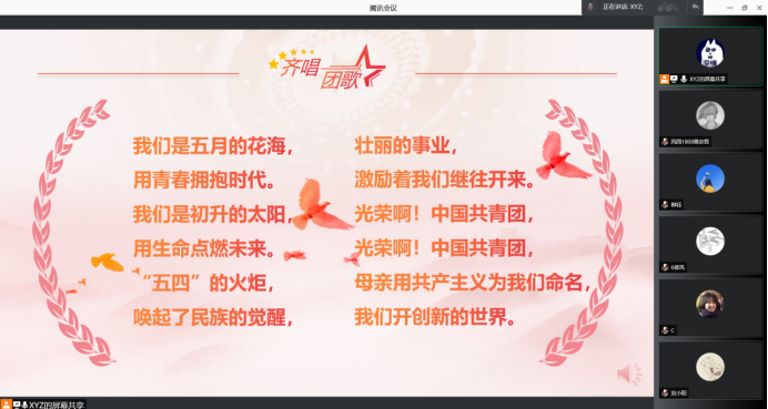 团日活动开始的第一个项目是齐唱团歌,在主持人谢逸岚同学的带领下,我们隔着屏幕齐唱了团歌。接下来,主持人带领我们观看了新闻联播里关于十九届六中全会的片段,并且为我们讲解了其意义内涵,时间与议程等,并且带着我们回顾了过去的六中全会以及十九届一中全会至六中全会的主题。然后,我们学习了党的百年内的四方面重大成就——百年来,党领导人民,浴血奋战、百折不挠,创造了新民主主义革命的伟大成就;自力更生、发愤图强,创造了社会主义革命和建设的伟大成就;解放思想、锐意进取,创造了改革开放和社会主义现代化建设的伟大成就;自信自强、守正创新创造了新时代中国特色社会主义的伟大成就。随后,我们一起观看了激动人心的2021年7月1日上午为庆祝中国共产党成立的100周年举办的大会的片段。然后,我们学习了深度解读的六中全会的意义探寻,总结成就经验的三方面意义——一是在建党百年历史条件下开启全面建设社会主义现代化国家新征程、在新时代坚持和发展中国特色社会主义的需要,二是增强“四个意识”、坚定“四个自信”、做到“两个维护”确保全党步调一致向前进的需要;三是推进党的自我革命、提高全党斗争本领和应对风险挑战能力、永葆党的生机活力、团结带领全国各族人民为实现中华民族伟大复兴的中国梦而继续奋斗的需要。而后,我们一起回顾展望了党的百年辉煌。接下来,由苏子康同学,柳钰同学和岑茂园同学分享了学习以及对十九届六中全会的理解。随后,我们观看了一段鼓舞人心的视频——青年当有志,立志在四方!并且在主持人的带领下一起学习了本周的青年大学习。接着,我们观看了不忘初心,砥砺前行主题的,由小班同学投稿的寄语。最后,在主持人的带领下,我们齐唱团歌,团日活动圆满结束。