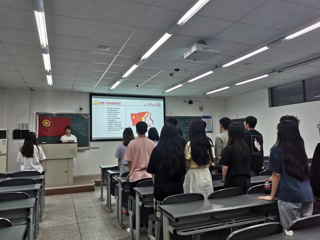 首先,我们在文娱委员的带领下齐唱团歌,让歌声引领我们走爱党爱团的学习氛围。
