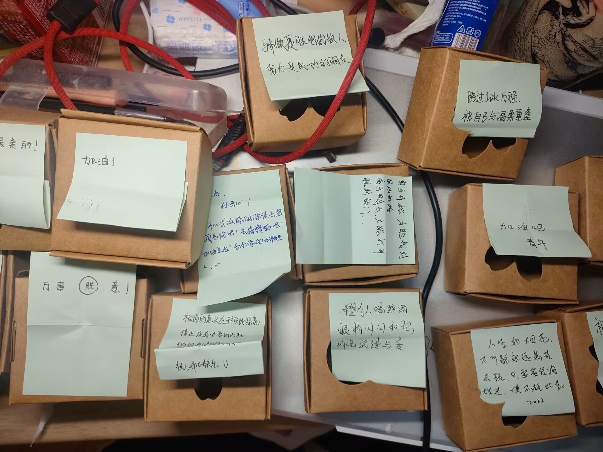 活动还设计了“交换心情解忧室”盲盒心情交换互动活动。参会同学可在两张小纸卡上分别写下自己的成长的烦劳和对他人的祝福鼓励,然后通过随机交换的方式,彼此互助解决共同的烦劳,同时相互砥砺、携手奋进。活动也期望通过这种视角,让大家从不同的视角感受志愿服务融入日常、化作经常的方式。