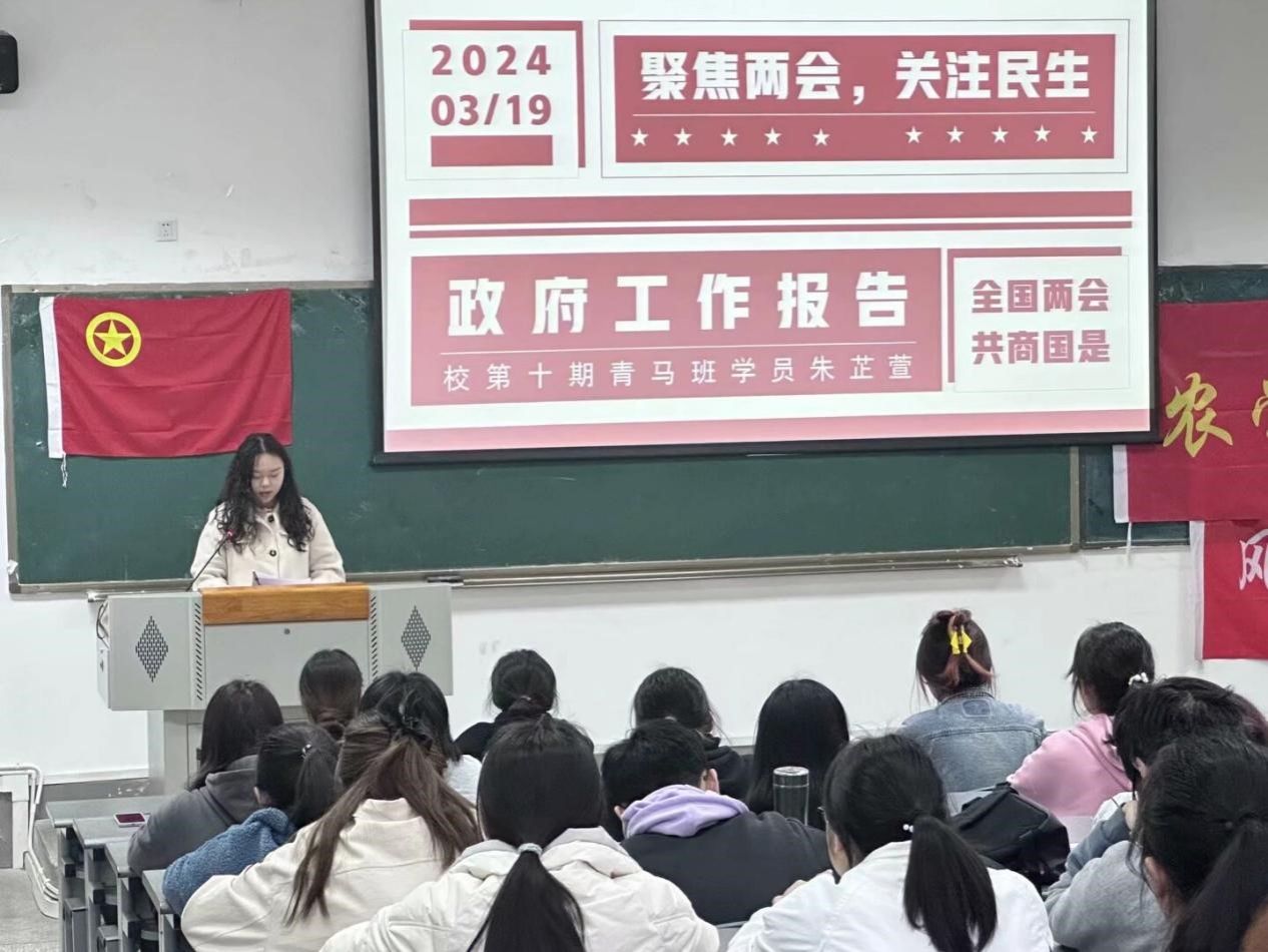 在班团活动现场,支部主要围绕两会精神开展学习活动。植保202202团支部万红伶领学了习近平总书记在全国两会上的系列重要讲话,让各支部同学再一次近距离学习领悟习近平总书记重要讲话精神。活动还邀请校级青马班的优秀91pron 朱芷萱和李铭宏领学全国两会内容。朱芷萱从就业、教育等五个民生方面分享了自己学习的收获;李铭宏从学习建设科技强国思想的角度,以川农人的身份,号召大家担当历史责任,争做新时代农业强国的建设者。