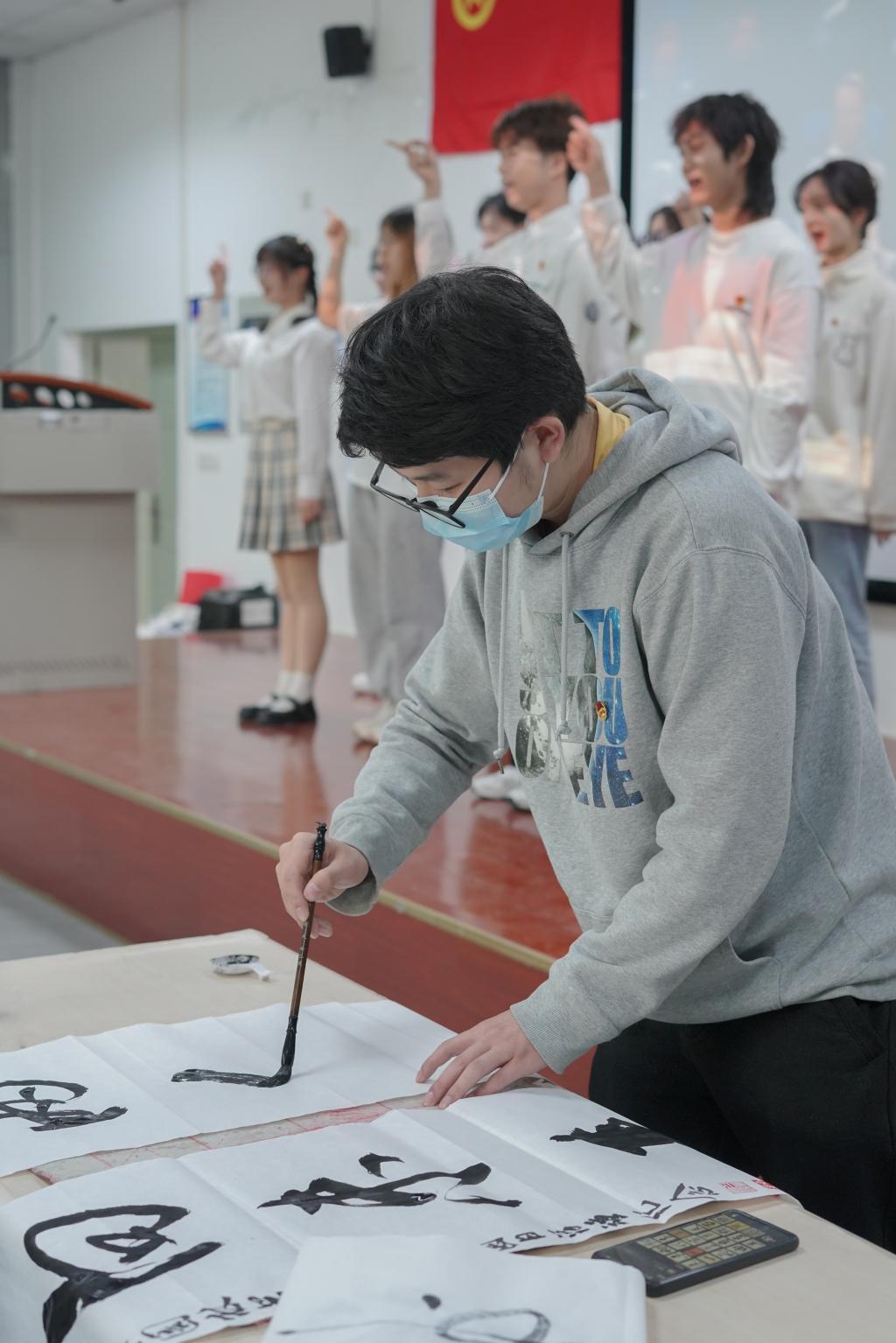 活动最后,91pron 啦啦队带来“一起向未来”手势舞表演,同时林91pron 书画队成员展示其主题的书法作品,共同合作完成表演。