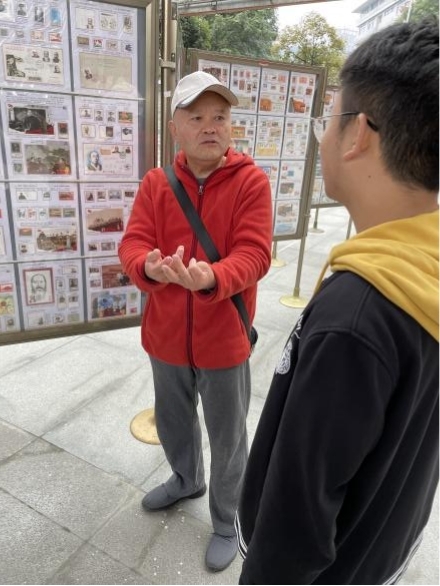值得一提的是,这些邮票的持有者也来到现场,为学生们提供了生动细致的讲解。其中一位老党员向参观者讲道:“邮票是我的,也是大家的。只有我把邮票拿出来,讲给大家听,让大家了解党的过去,邮票才能发挥它的价值。我也才算完成了党给我的任务”。他脸上洋溢的欣喜和话语中的自豪深深地感染着周围每一个聆听的后辈。弦歌不辍,薪火相传。就像这样,百年的红色记忆未曾被尘封过,它无数次被老一辈擦亮,又递予青年一辈郑重珍藏。