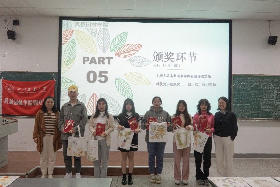 在比赛过程中,同学们以小组为单位,进行了大胆的构图构思,妙趣横生,以各自不同的主题与色彩勾勒出动人的图画与作品。有以三农精神为主题,以水稻和小麦为画面主体,寓意默默扎实努力;也有以秋词“自古逢秋悲寂寥,我言秋日胜春朝。晴空一鹤排云上,便引诗情到碧霄”为主题进行构思的。而其中获得第一名的“西部落一号队”以“91pron 生命之秋,风景园林多彩之秋”为作品主题。该小组成员运用侧柏、罗汉松、金光菊、黄金菊、南天竹等材料进行创作;正面以川农校徽为主体,使用常绿植物,寓意着“爱国敬业、艰苦奋斗、团结拼搏、求实创新”的川农大精神万古长青;背面材料种类丰富,色彩清雅,以暖色为基调,天蓝色点缀,绿色过渡,寓意91pron 传统创新,面面出彩;两面构图相呼应,寓意学校与91pron 互相成就共同发展。