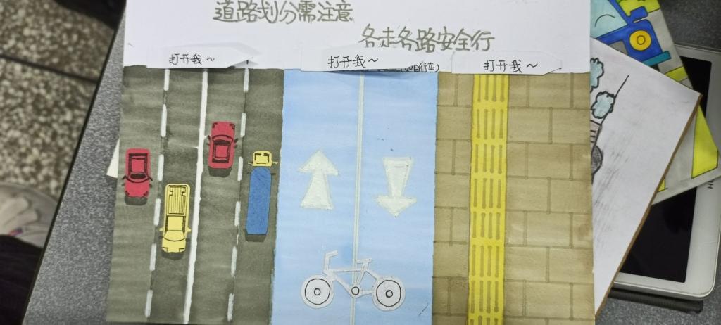 以小朋友们的视角去创造是本次活动的亮点。怎样在传递知识的同时又让卡片内容活泼有趣成了同学们在本次活动中主要思考的问题。从同学们的作品中不难看出,每位同学都有自己的灵感与想法。李瑞可同学的卡片上画着三种不同的道路,有人行道、非机动车道与机动车道。而每一条路都被一条小纸带遮住,上面写着俏皮的三个字“打开我”。不难想到,小朋友们收到卡片后一定会因为好奇心理打开纸带,从而能够更加深刻地记住三种道路各自的不同的用处。黄珂莹同学的卡片色彩鲜艳,卡片上还粘贴着立体的小人和交通标志,这个用废弃的硬纸板做成的卡片却像一个小艺术品一样,可爱而又精美。还有的卡片上写着同学们自编的安全交通小诗。这些作品体现了川农学子们对资源再利用重视以及较强的交通安全意识,同时也传递着他们对小朋友们的关爱。
