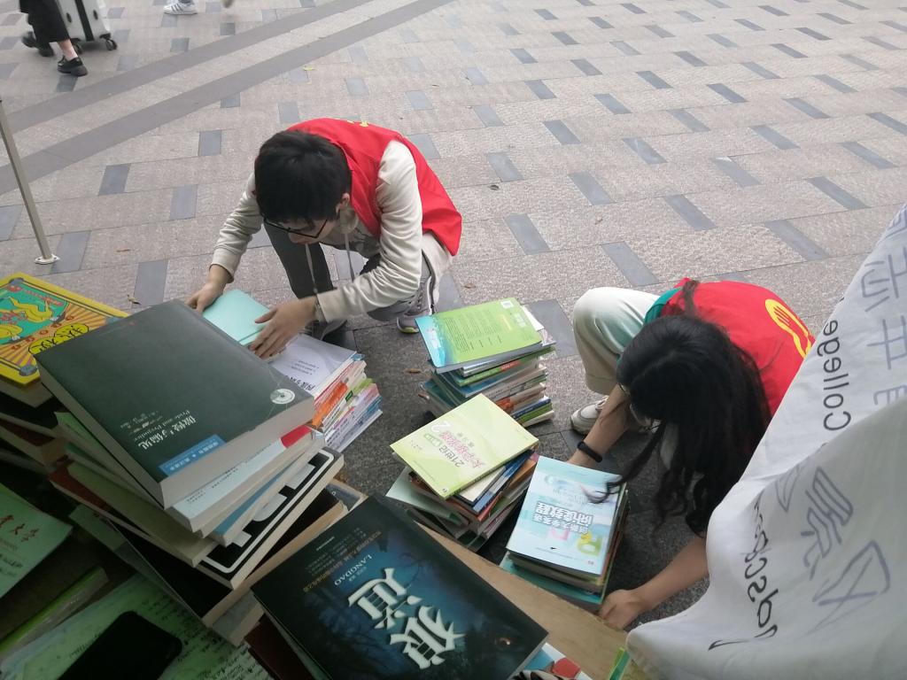 17日上午,活动负责人早早地搬来了桌椅、搭好帐篷,并贴上了“图书义卖”的标语。招募的志愿者们随后也赶来设点处集合签到。组织人员在志愿者到齐后号召大家开完短会,说明了活动中需要注意的事项后,志愿者们便积极投入到了志愿公益活动中。参与图书募捐的同学在活动前期已留下寝室号并把书籍放在了寝室门口,志愿者们便按照捐书者留下的寝室号前往相应的寝室门口搬书。在设点处的值守的志愿者们将搬过来的书籍按照类型、专业分类摆好,方便同学们购买。大家各司其职,现场氛围十分和谐。义卖结束后,相关活动人员统计好义卖金额并将其保管。所得善款将全部用于暑期的支教活动,为偏远地区的孩子们送去温暖与希望。