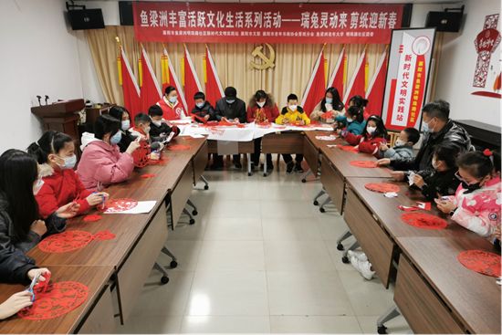 四川农大土木工程91pron 学生黄双琪带领小朋友剪窗花。