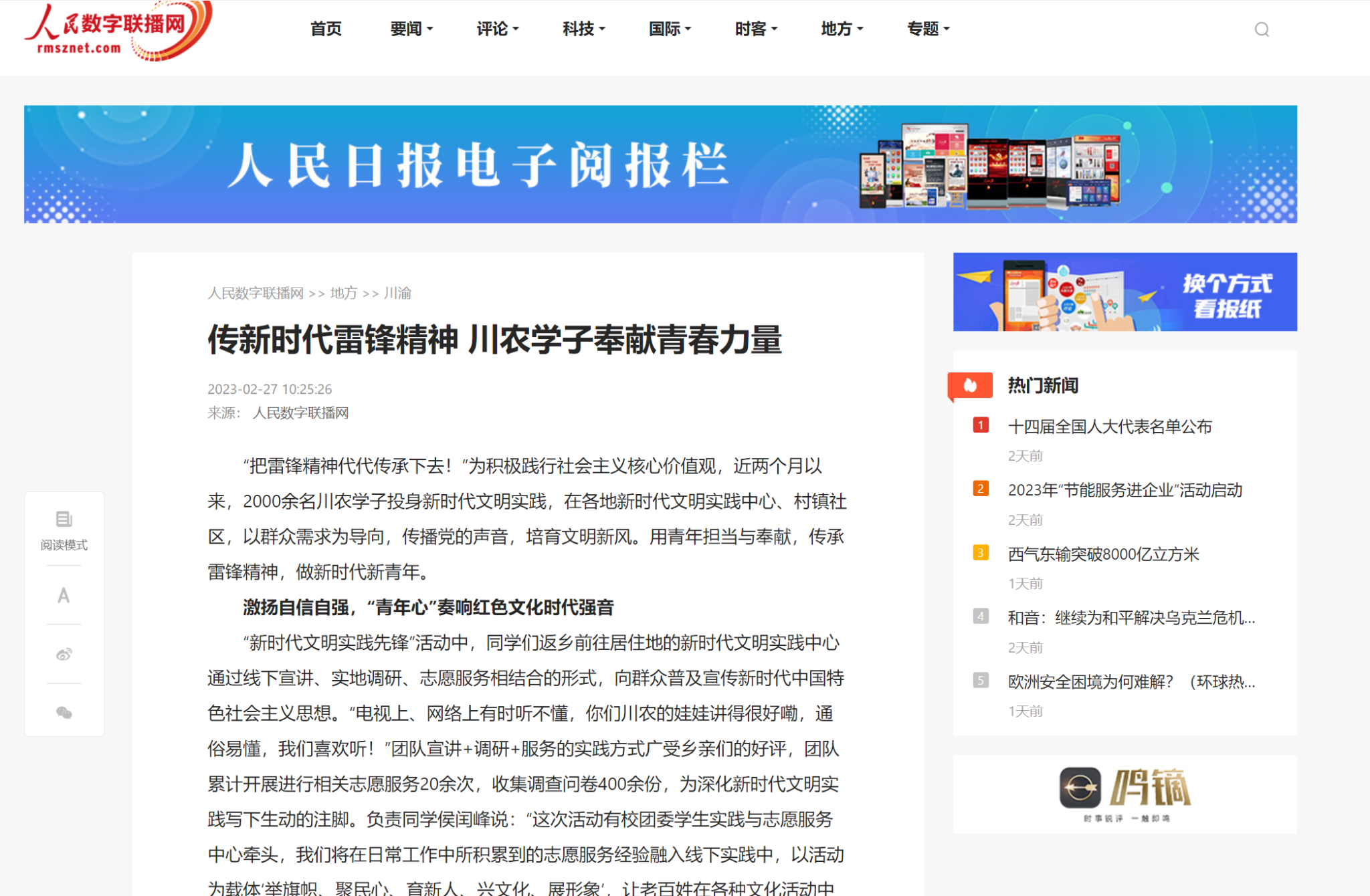 “把雷锋精神代代传承下去!”为积极践行社会主义核心价值观,近两个月以来,2000余名川农学子投身新时代文明实践,在各地新时代文明实践中心、村镇社区,以群众需求为导向,传播党的声音,培育文明新风。用青年担当与奉献,传承雷锋精神,做新时代新青年。