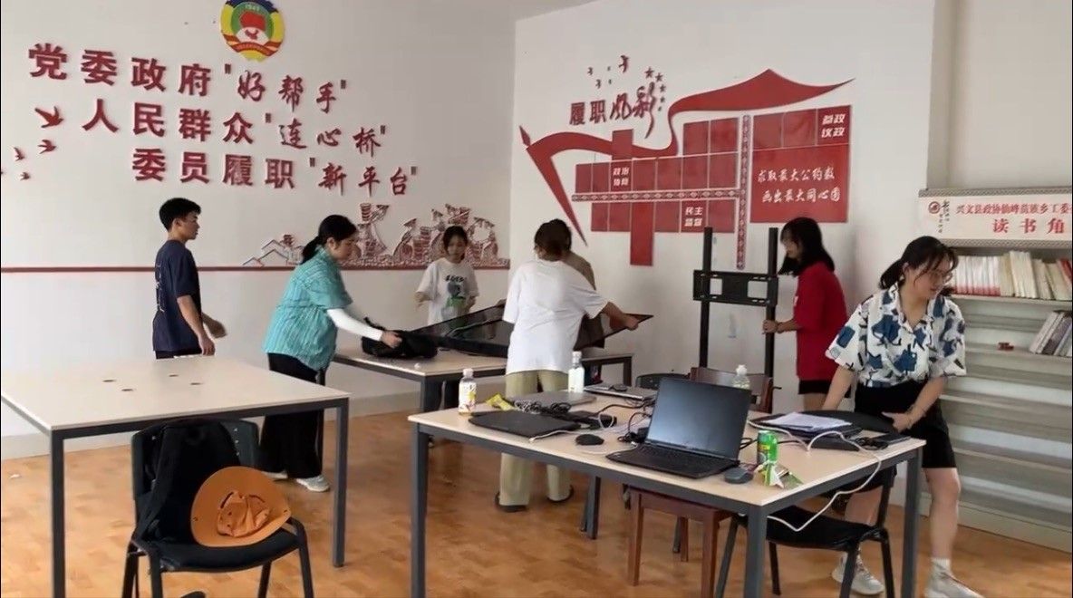 当天下午,团队成员们来到教学地点,整理相关教学用具及设备后,根据教学规划中不同年龄段小组,和教学管理方案进行针对性的布置。团队没有采用常规可谈“一人一桌”的布置方式,选择以一个桌面一个小组为划分方式,旨在打造小组互动式学习体验。此外,团队成员员还对多媒体等教学设置的设置进行了优化,对包括读书角、教室墙、电线排布等都做了新的调整,以保证教学课件完整呈现和授课过程中的安全。