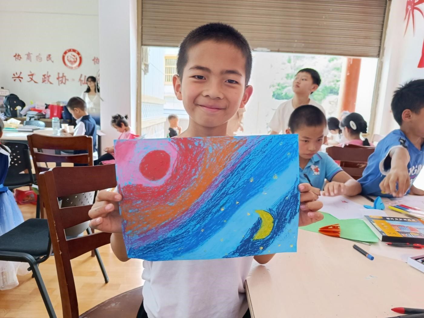 不同与传统的课堂形式和内容,川农风院志愿者结合自身专业特点,在首堂支教课就开设了手工涂鸦和剪纸的课程。手把手教留守孩童拿起画笔,画下他们的天空,画下他们的欢声笑语和无忧无虑,画下属于他们的未来;教小朋友们用剪刀,剪出一个又一个笑脸,剪出大大的千纸鹤飞行蔚蓝天际。授课过程中,遇到小鹏的提问和为难不解等,风院志愿者一笔一画、一剪一缕耐心为他们讲解,帮助小朋友们培养一些兴趣爱好。