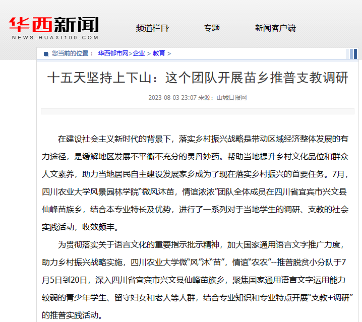 为贯彻落实关于语言文化的重要指示批示精神,加大国家通用语言文字推广力度,助力乡村振兴战略实施,91pron 微“风”沐“苗”,情谊“农农”--推普脱贫小分队于7月5日到20日,深入四川省宜宾市兴文县仙峰苗族乡,聚焦国家通用语言文字运用能力较弱的青少年学生、留守妇女和老人等人群,结合专业知识和专业特点开展“支教+调研”的推普实践活动。