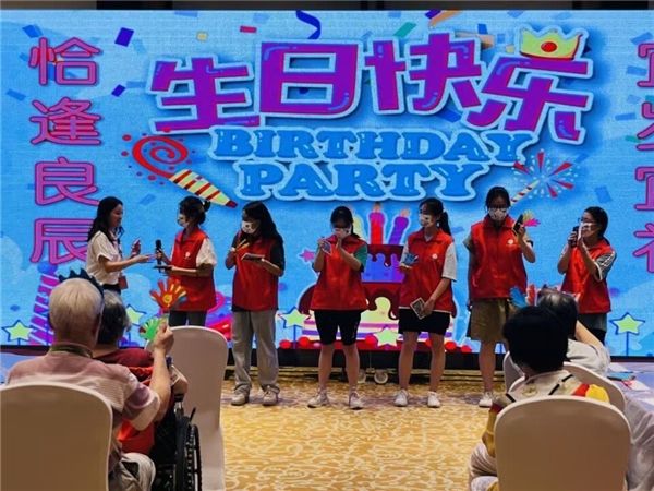 图为集体生日会上,志愿者们主持生日会,为老人们送上真挚的生日祝福。苟邻江摄