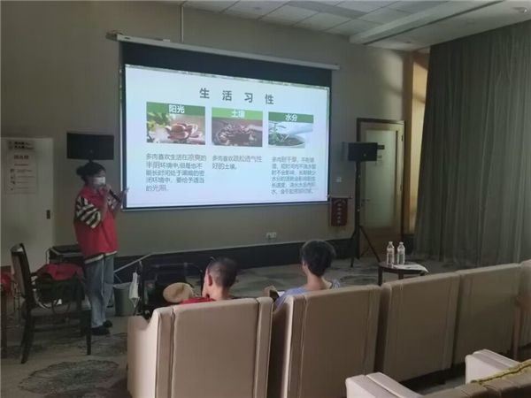 图为植物养护讲解课程上,志愿者介绍多肉植物的生活习性。邱裕桐摄