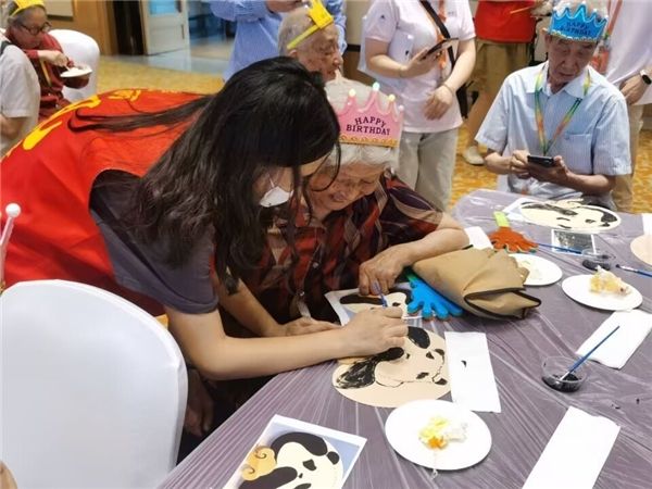 在七月下旬的集体生日会上,团队成员们协助每位老人绘制可爱又实用“熊猫”图样的手工扇,并且齐唱生日快乐歌、共同划分生日蛋糕,让老人们在七月结束之际欢聚一堂,共度一次快乐美好的生日聚会。