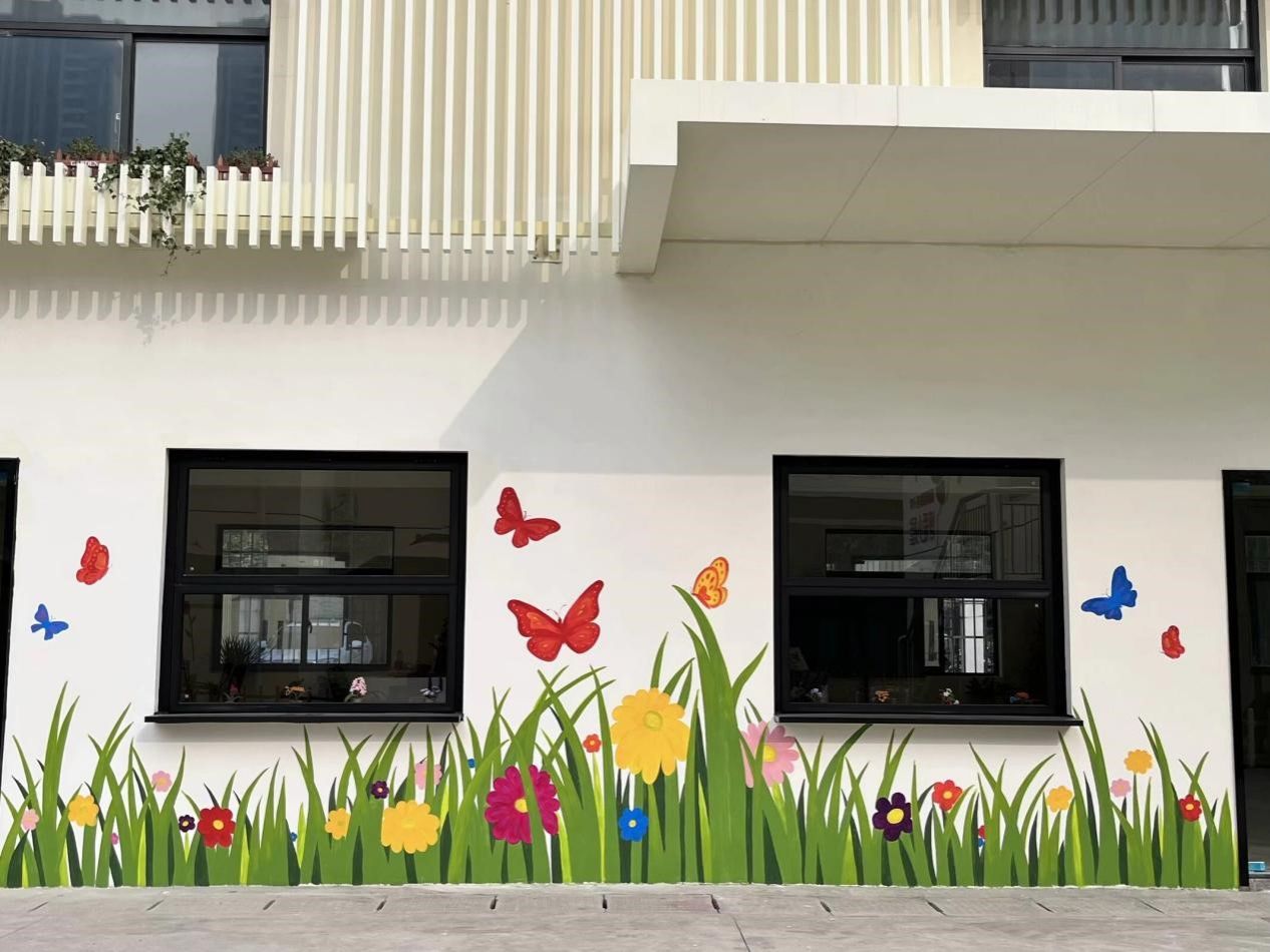 在调研过程中,团队成员注意到社区中一处景观:纯白色的墙面上绘制了五彩斑斓的图案,翠绿色的草坪上飞满了蝴蝶,就连台阶上也都画上了五颜六色的花。“每次放学我都会叫上我的好朋友们一起在这里玩游戏,我喜欢这里!”社区内的居民小朋友激动地向成员们说道。