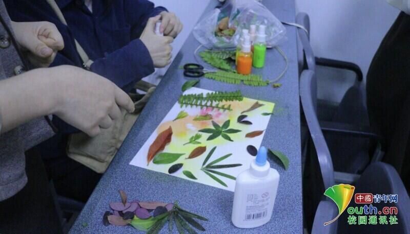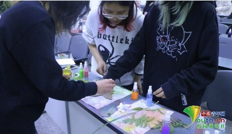 “我想通过树叶的剪影,树叶的纹路,展现自然的样子。”来自环境设计的蒋宇昕说到自己的创作灵感。当谈到这里时,来自风景园林专业的李佳敏表示,刚开始时她并没有什么灵感,她讲道:“首先,我考虑到主要材料是绿叶,之后又联想到了可以运用每片树叶独特的形状和脉络作画。”她还分享到,在创作时,她为了使喷画颜色更丰富,将不同的颜料混合调配出了新的色彩。