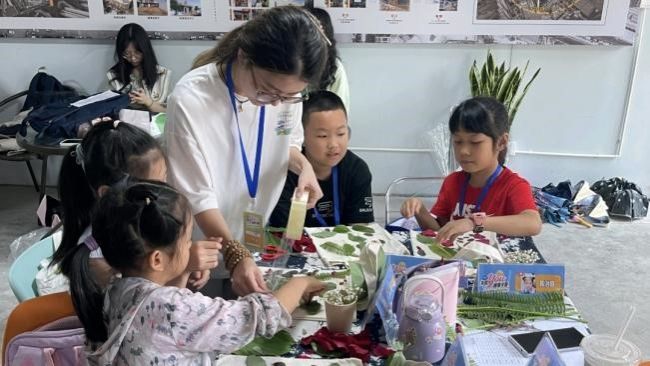(图为花生志愿服务团队成员教小朋友粘贴植物 杜馨怡 供图)