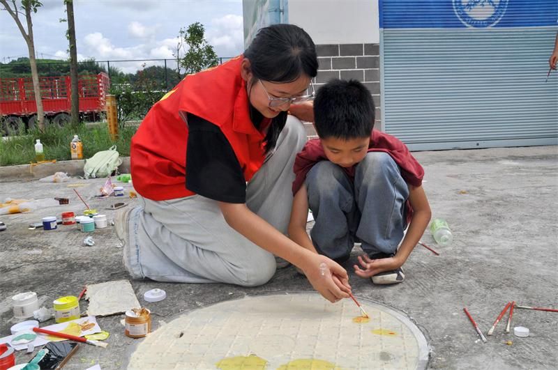 (图为团队成员带领夏令营同学进行井盖彩绘 陈柯燚 供图)