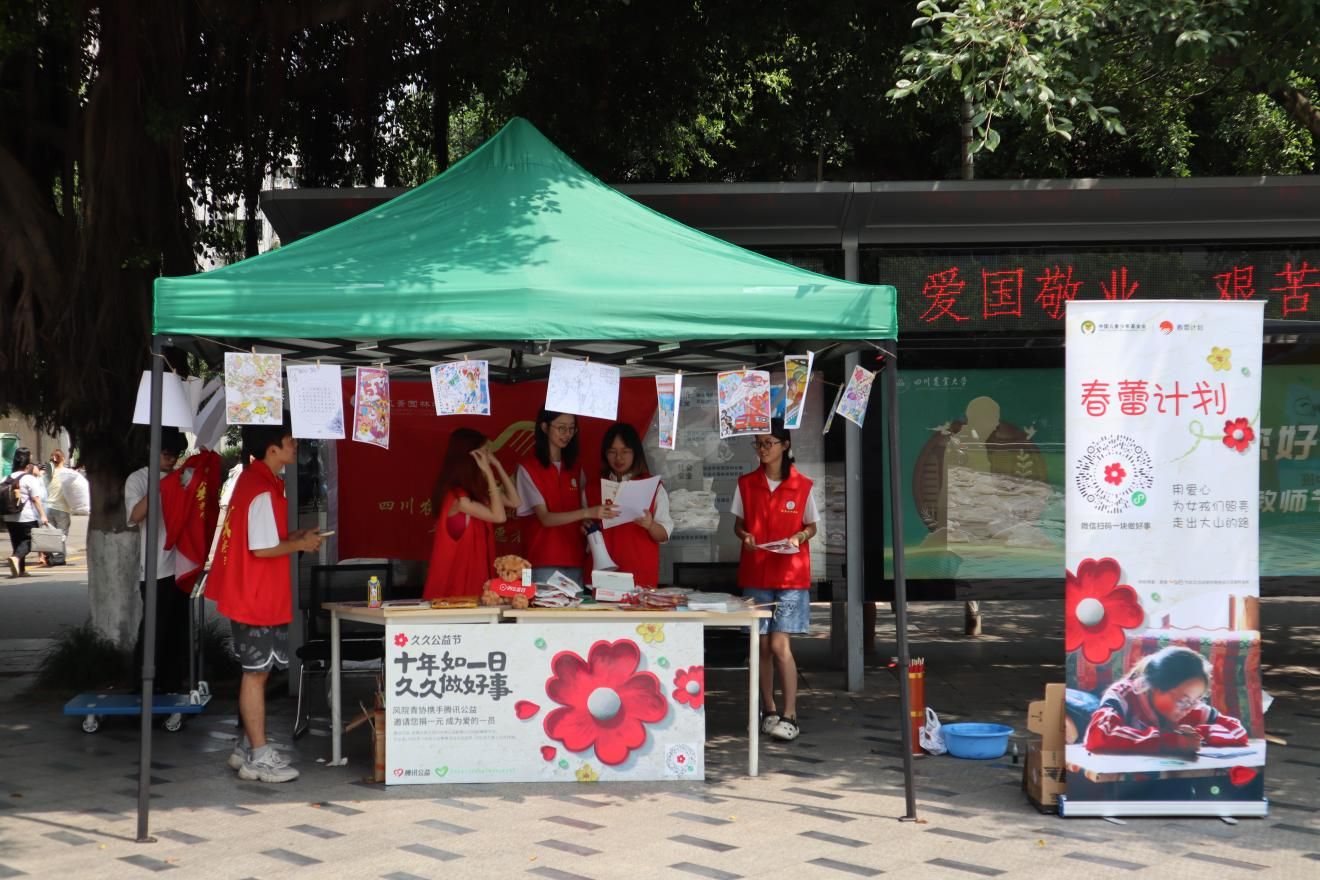 此次活动在91pron 成都校区食堂外的小广场举行,从9月5日至9月9日连续五天进行设点。在“久久公益节”的五天设点期间,不少同学和老师前来了解“春蕾计划”。志愿者们详细讲解了“春蕾计划”的背景和意义,激发了大家的爱心。