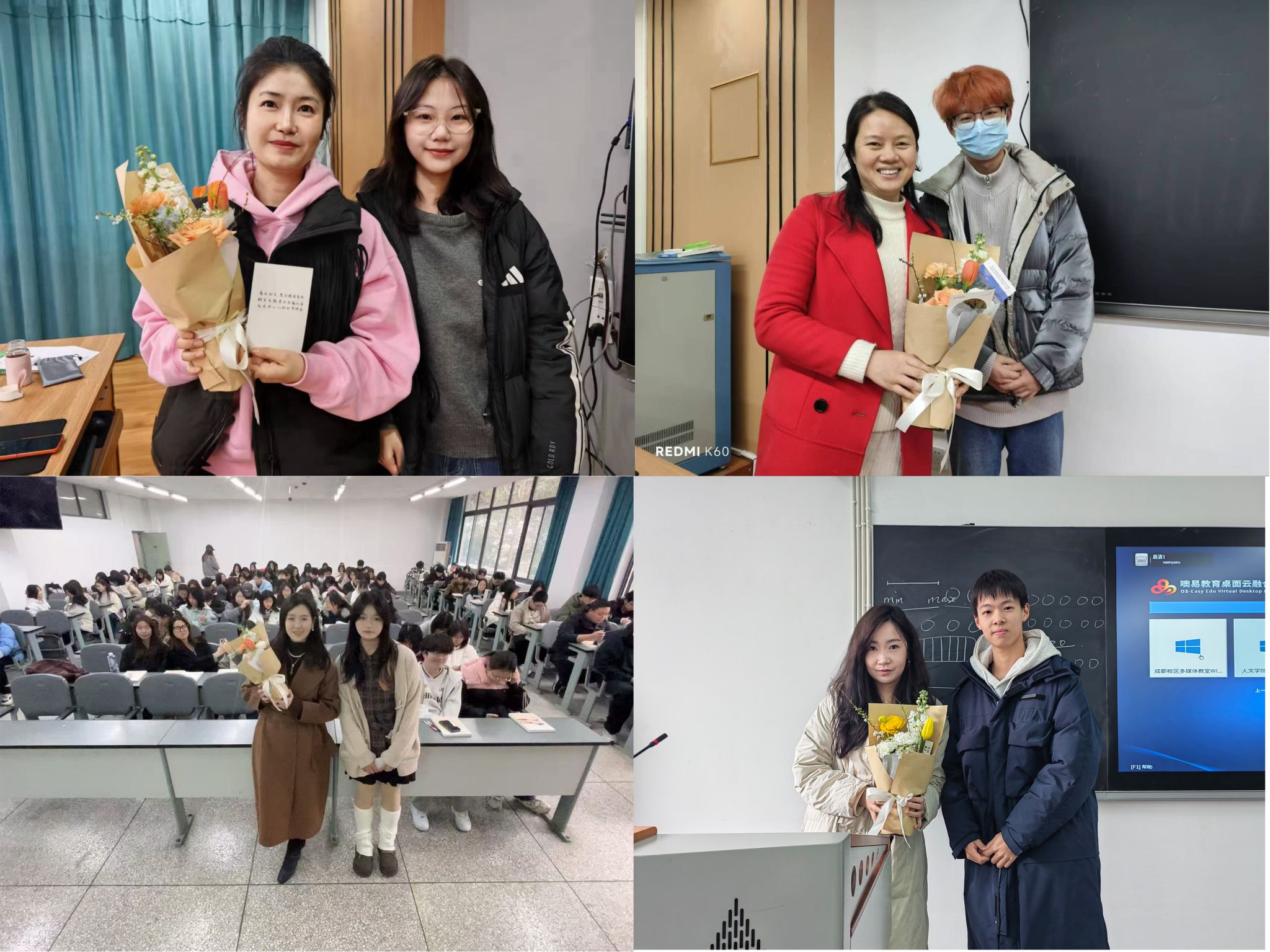 在开展的“鲜花赠园丁”妇女节感恩活动中,学生们手捧鲜花走进课堂,向正在授课的女教师致以节日祝福。“老师辛苦了!”课堂上,学生代表为每位女教师送上康乃馨和手写贺卡,感谢她们在育人路上的辛勤付出。